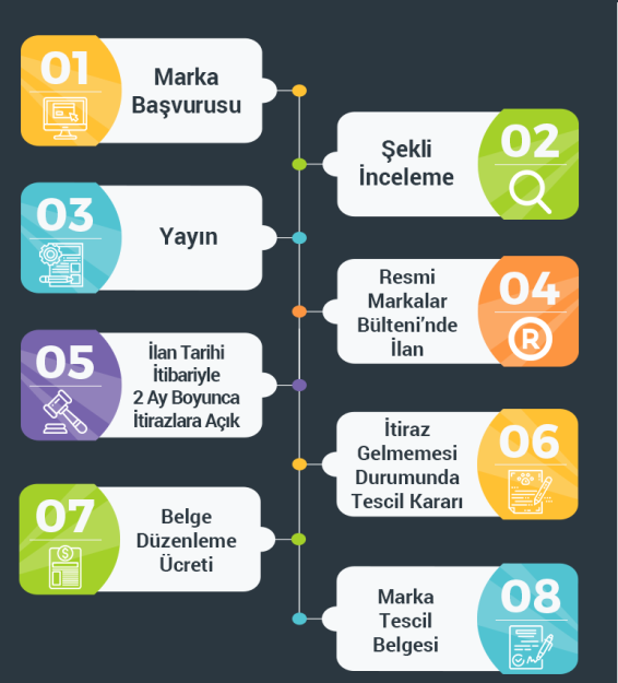 Aşağıda Marka Tescil Belgesi almak için izlenmesi gereken yol haritası bulunmaktadır.